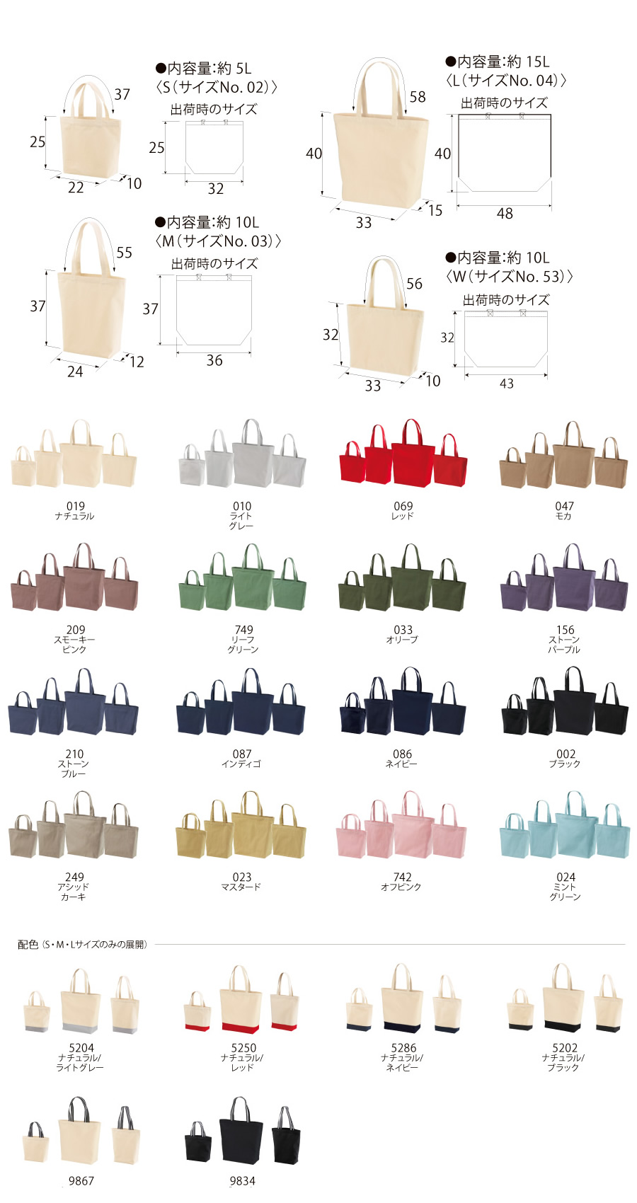 | 8.3オンス キャンバス生地のトートバッグ ナチュラル・カラー・配色のカラー展開 S・M・L・Wの4サイズ 定番キャンバストートバッグ |
